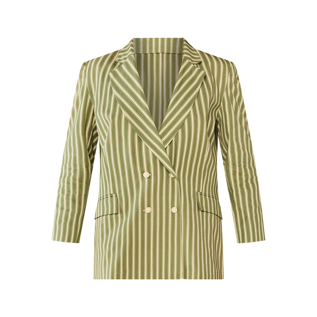100% BCI cotton twill. Double-breasted front. Green and white striped pattern. Oversized tailored silhouette. Two front pockets. Made in India.