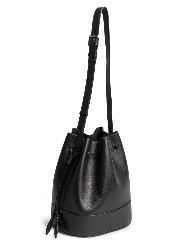 Nappa leather exterior. Adjustable shoulder strap. Custom drawstring closure. Fully lined interior. Signature tagua seed charm. Made in Spain.
